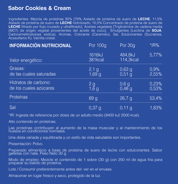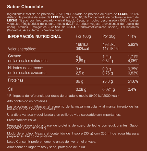 Aporta la mayor pureza del mercado: más de un 90% de proteína por dosis, con mínima cantidad de grasa, azúcar y lactosa.